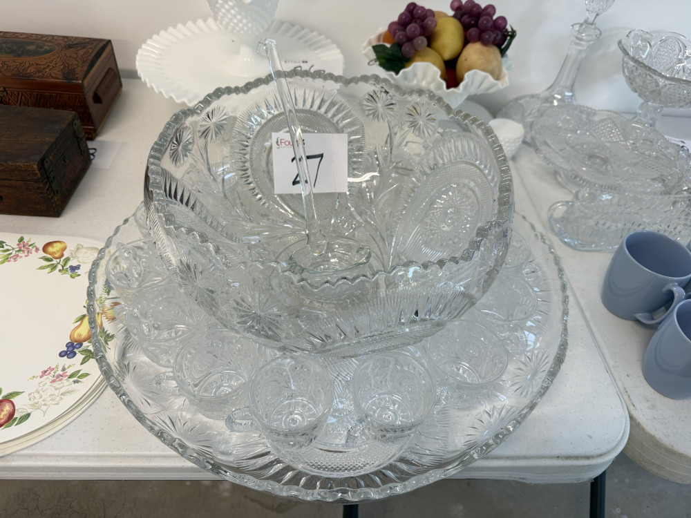 HUGE PUNCH BOWL WITH MUGS, GLASS LADEL, PLATTER (#27) JACK & BARBARA CHAPMAN ESTATE, COOKSON OK
