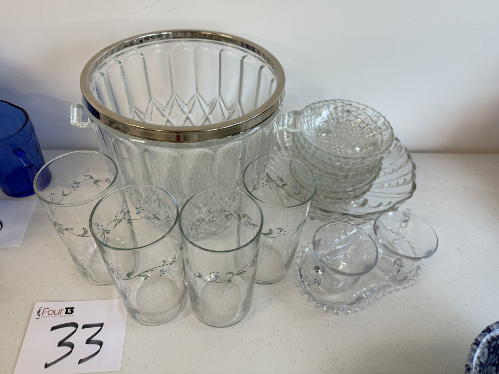 GLASS ICE BUCKET, DRINKING GLASSES, ASSORTED GLASS (#33) JACK & BARBARA CHAPMAN ESTATE, COOKSON OK