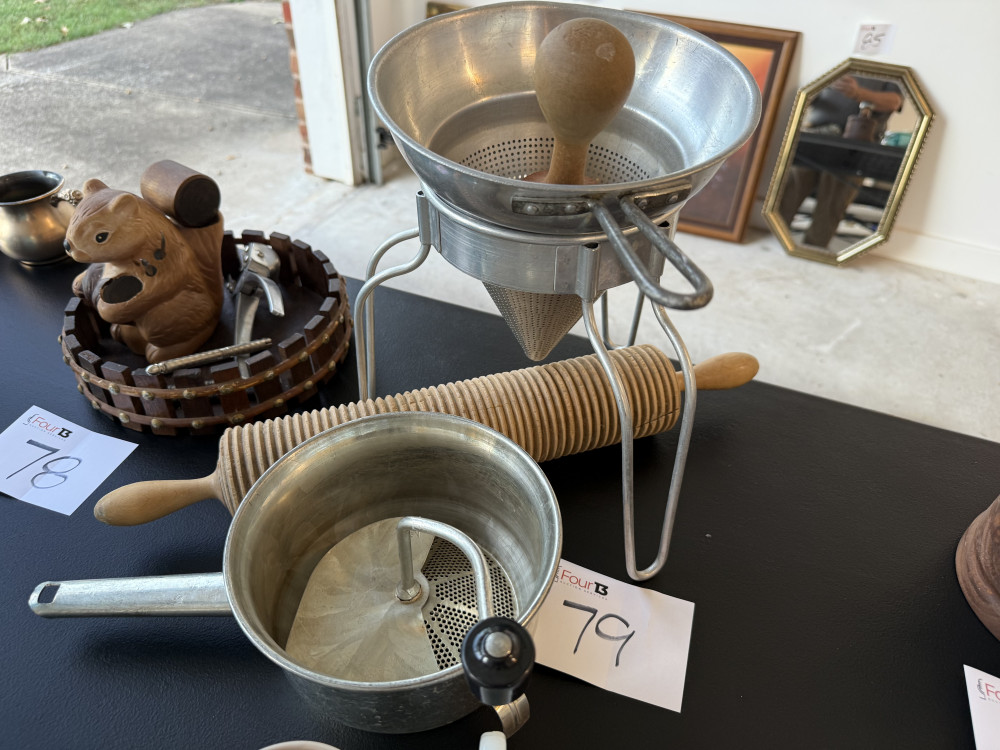 CONE SIEVE W/PESTLE, FOOD MILL, LATTICE ROLLING PIN (#79) JACK & BARBARA CHAPMAN ESTATE, COOKSON OK