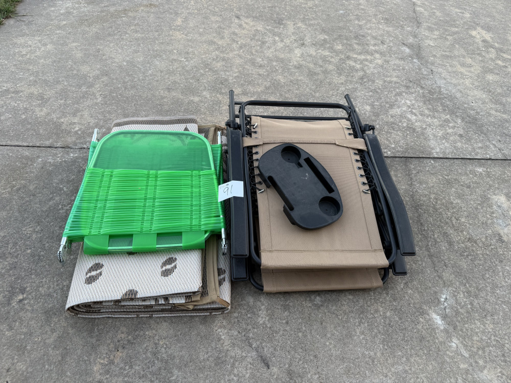 (2) ZERO-GRAVITY LOUNGE CHAIRS, (1) TRI -FOLD LOUNGE CHAIR, OUTDOOR RUG (#91) JACK & BARBARA CHAPMAN ESTATE, COOKSON OK