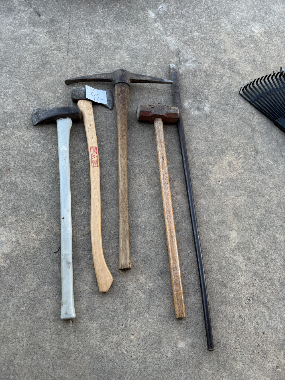 (2) SPLITTING MAULS, (1) PICK, (1) SLEDGE HAMMER, (1) ROCK BAR (#92) JACK & BARBARA CHAPMAN ESTATE, COOKSON OK