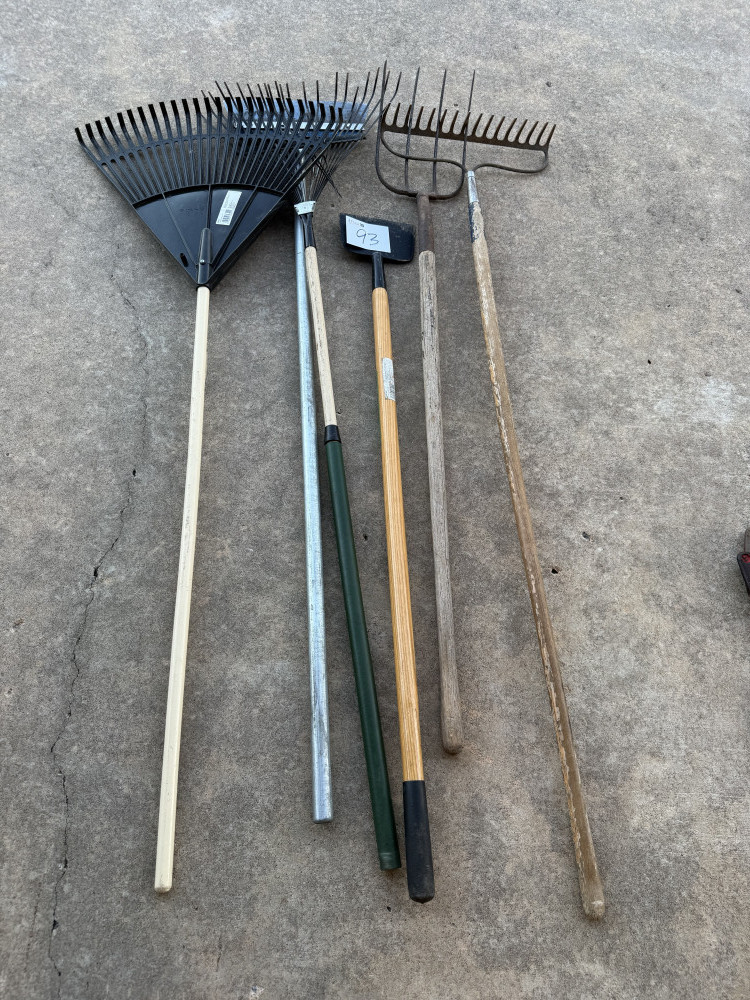 RAKES, PITCHFORK, YARD TOOLS (#93) JACK & BARBARA CHAPMAN ESTATE, COOKSON OK