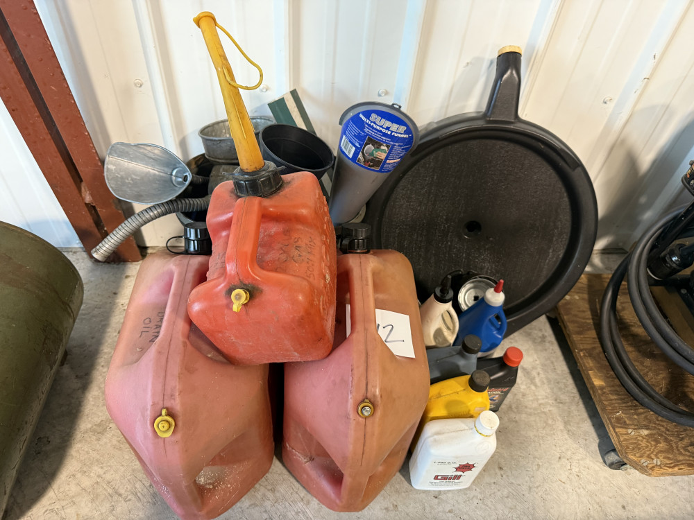 GAS CANS, USED OIL TANK, FUNNELS (#112) JACK & BARBARA CHAPMAN ESTATE, COOKSON OK