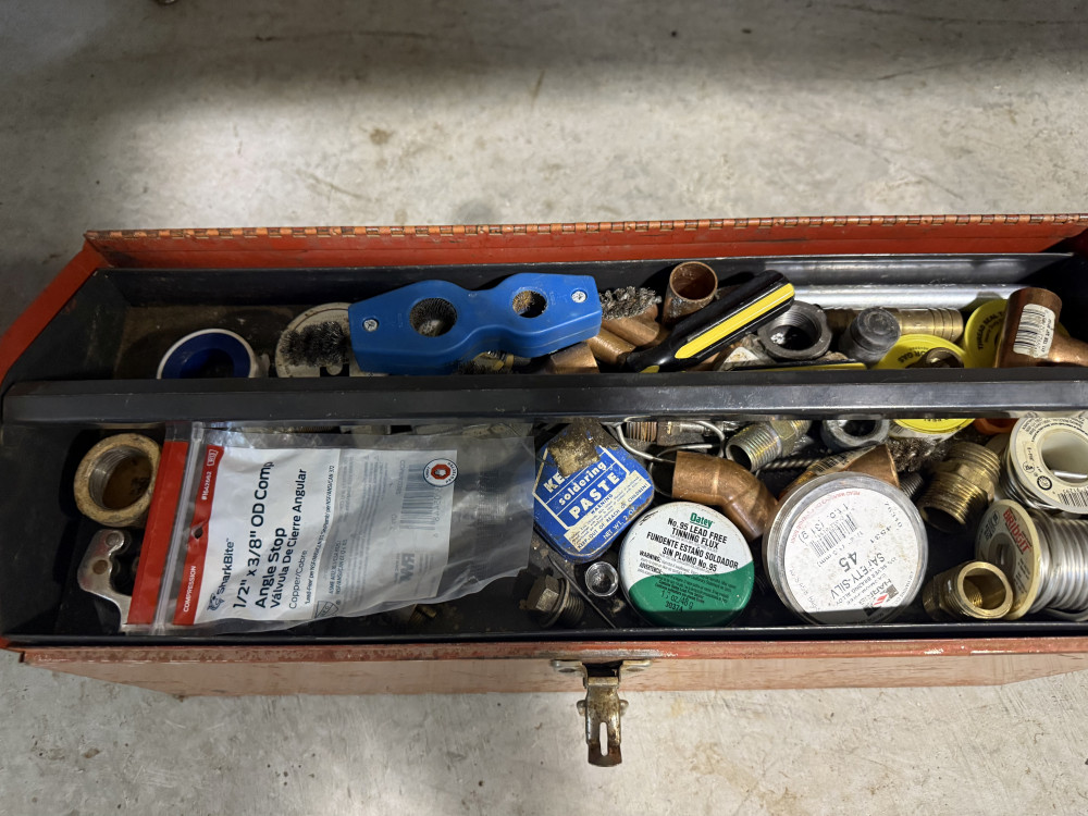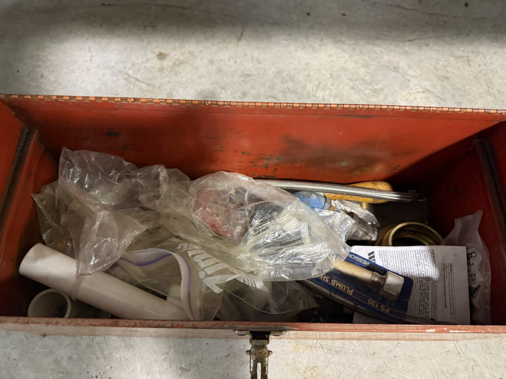 METAL TOOL BOX W/PLUMBING SUPPLIES CONTENTS (#136) JACK & BARBARA CHAPMAN ESTATE, COOKSON OK
