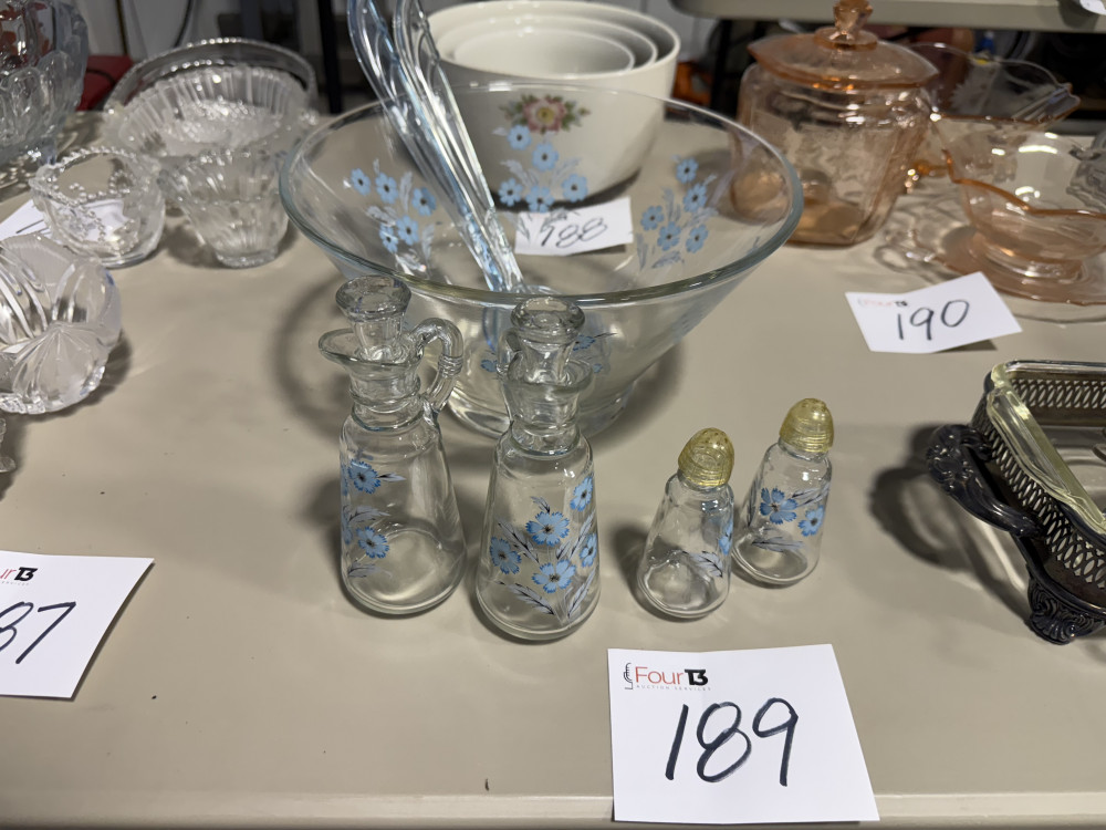 VINTAGE CULVER GLASS SALAD BOWL W/OIL & VINEGAR CRUETS, S&P SHAKERS (#189) JACK & BARBARA CHAPMAN ESTATE, COOKSON OK