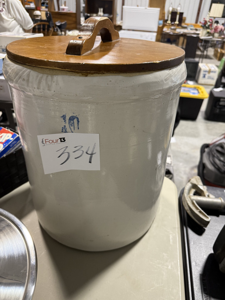 10 GAL CROCK WITH WOODEN LID (#334) JACK & BARBARA CHAPMAN ESTATE, COOKSON OK