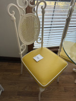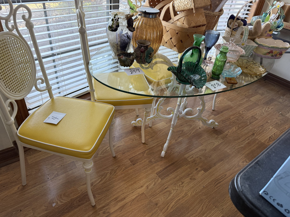 GLASS TOP WROUGHT IRON TABLE WITH FOUR CHAIRS (#4) JOANN EDWARDS ESTATE, ROLAND OK