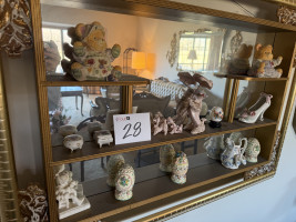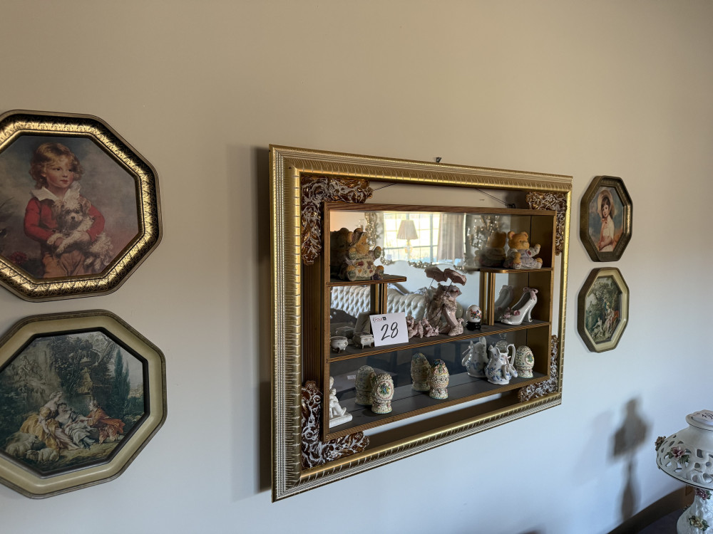 CURIO MIRROR WITH CERAMICS AND WALL DECOR (#28) JOANN EDWARDS ESTATE, ROLAND OK