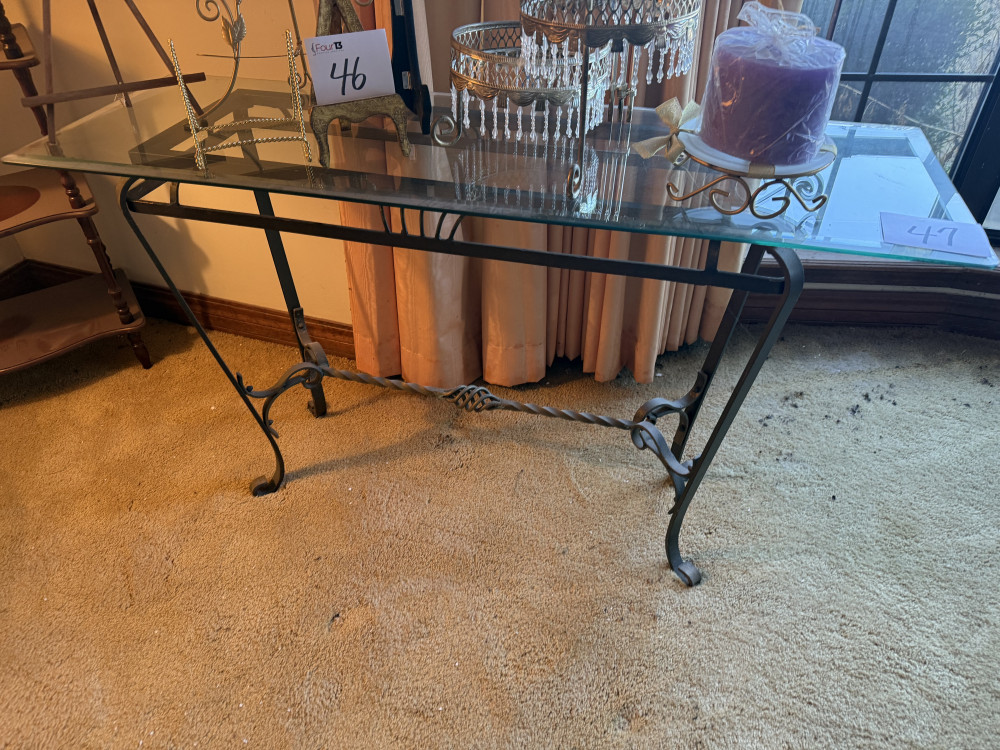 GLASS TOP WROUGHT IRON TABLE (#47) JOANN EDWARDS ESTATE, ROLAND OK