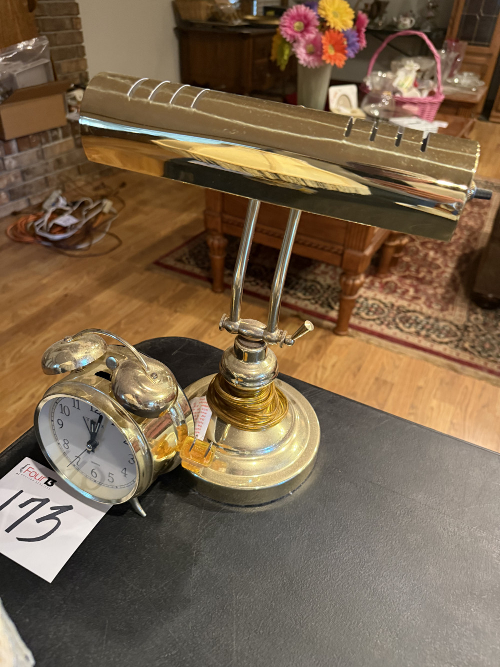 BRASS BANKERS LAMP, TWIN BELL ALARM CLOCK (#173) JOANN EDWARDS ESTATE, ROLAND OK
