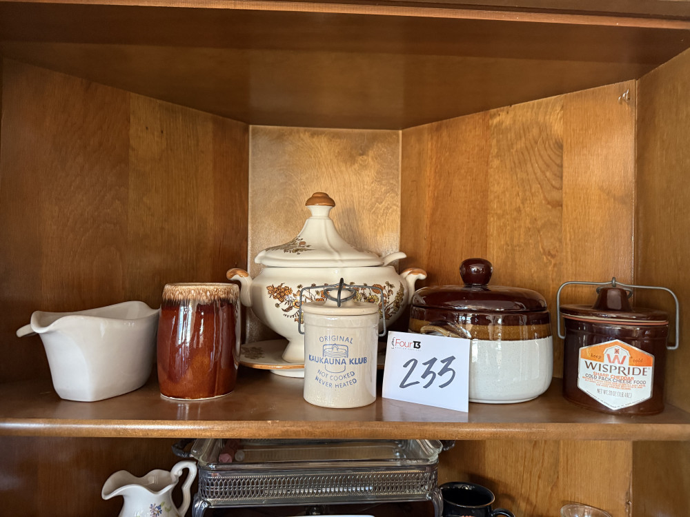 VINTAGE CROCKS, FRANKOMA GRAVY BOAT, CERAMIC SOUP TUREEN (#233) JOANN EDWARDS ESTATE, ROLAND OK