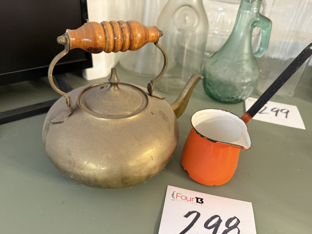 BRASS KETTLE W/WOODEN HANDLE, ENAMEL TURKISH COFFEE POT (#298) JOANN EDWARDS ESTATE, ROLAND OK