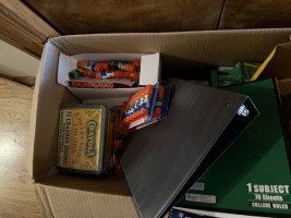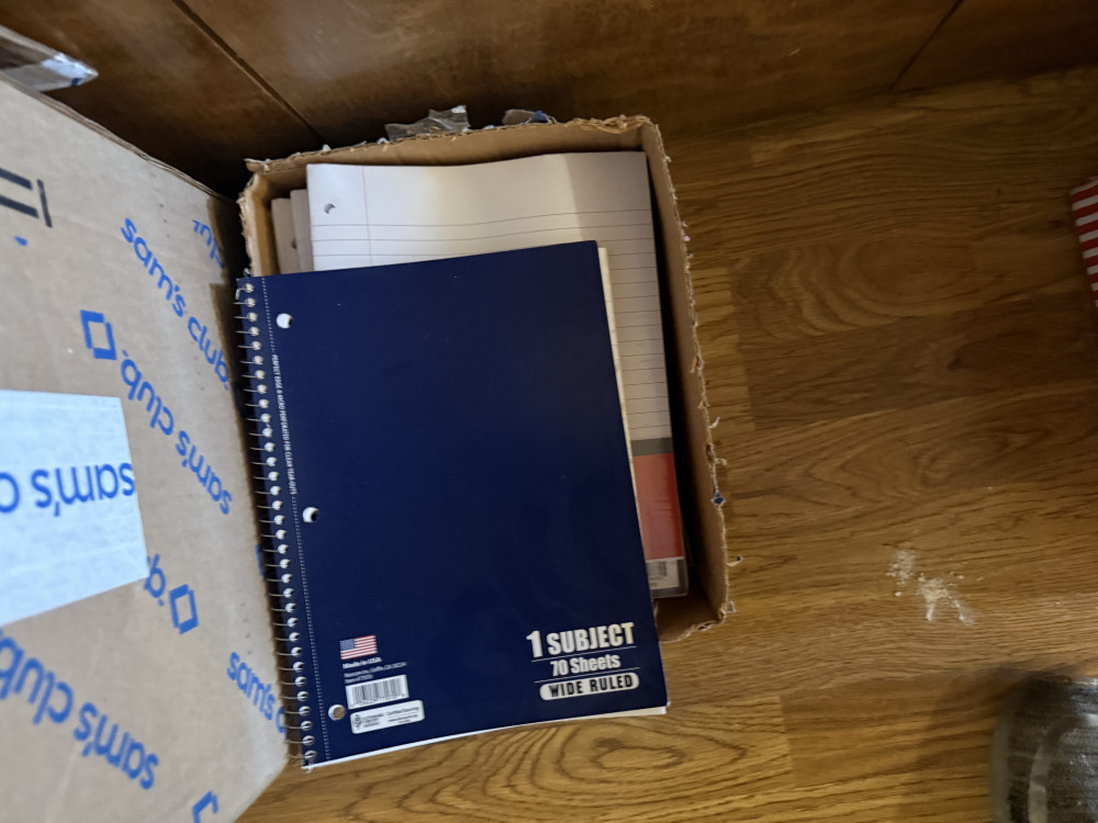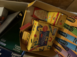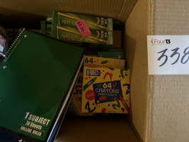 BOX LOT OF SCHOOL SUPPLIES, NOTEBOOKS, CRAYONS (#338) JOANN EDWARDS ESTATE, ROLAND OK