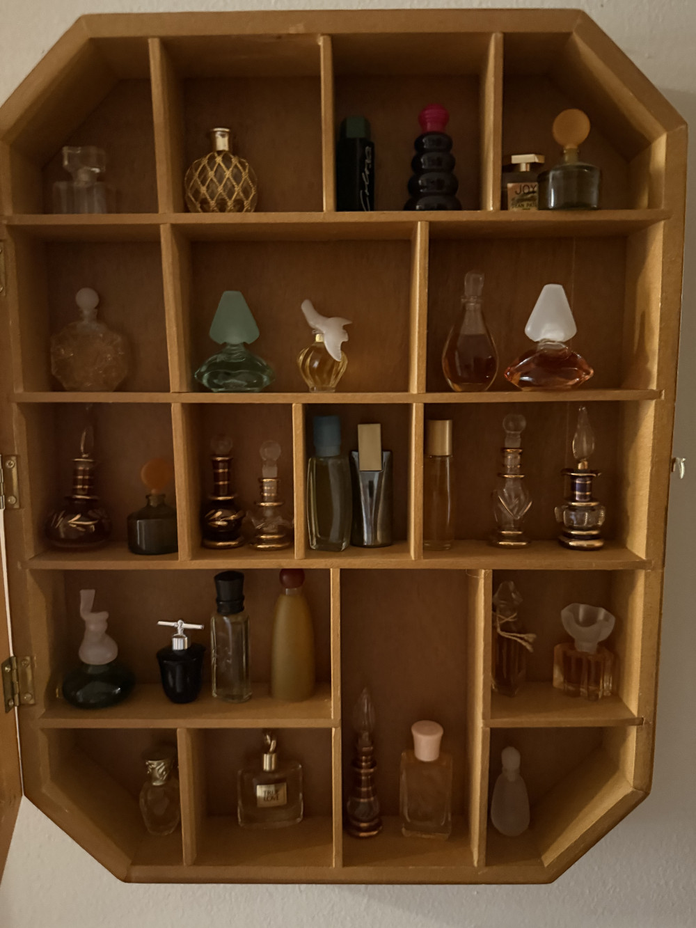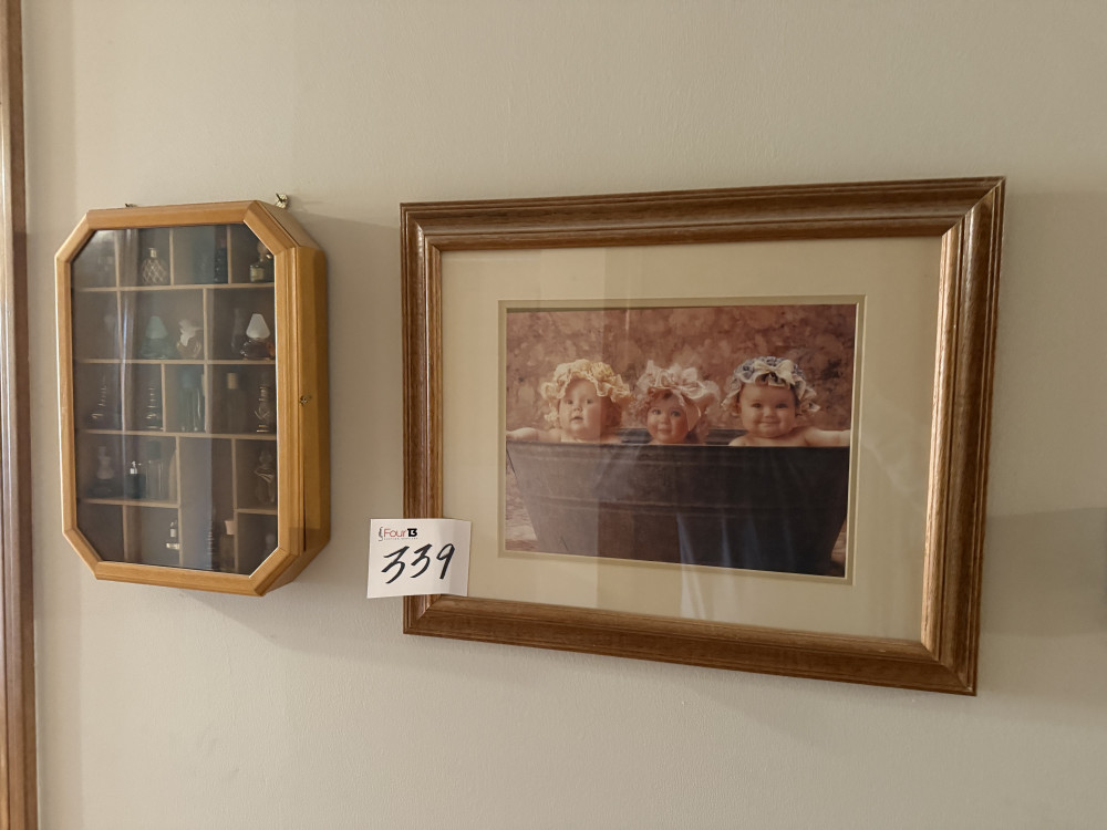 WALL CURIO W/PERFUME BOTTLES…MANY AVON, FRAMED PRINT (#339) JOANN EDWARDS ESTATE, ROLAND OK