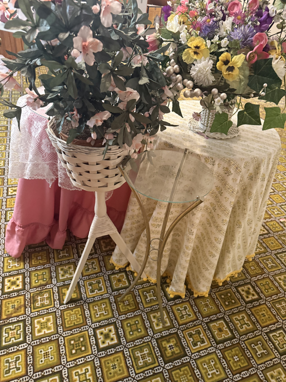 TABLES, WICKER PLANTER, GLASS SIDE TABLE, BASKET PLANTER (#985) JOANN EDWARDS ESTATE PART 2, ROLAND OK