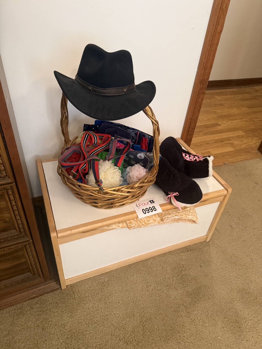 SMALL HOPE CHEST, FELT HAT, BASKET W/CONTENTS (#998) JOANN EDWARDS ESTATE PART 2, ROLAND OK