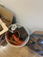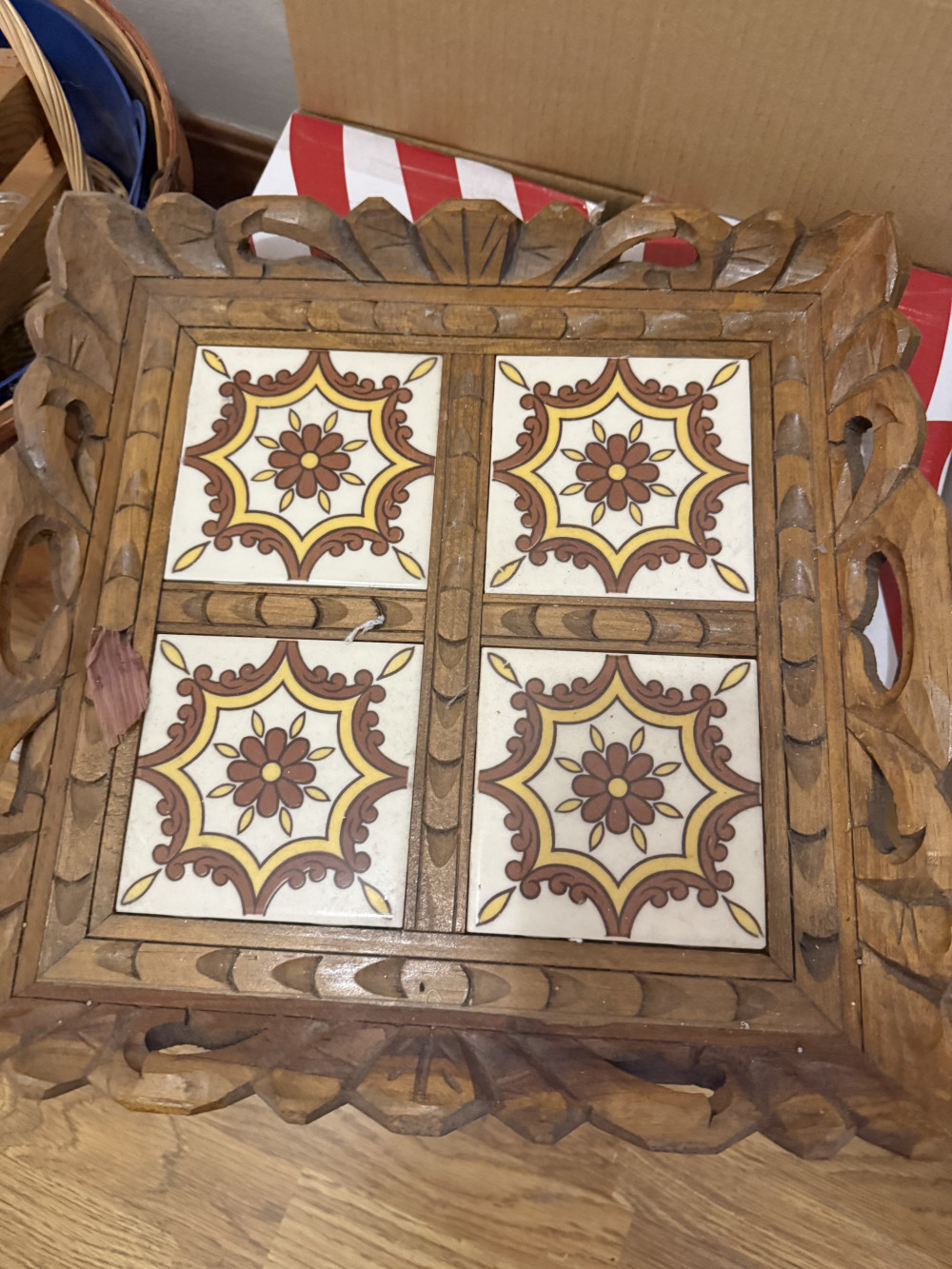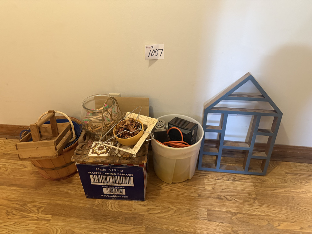 WALL CURIO, BASKETS, EXTENSION CORD, WOOD/TILE SERVING TRAY (#1007) JOANN EDWARDS ESTATE PART 2, ROLAND OK