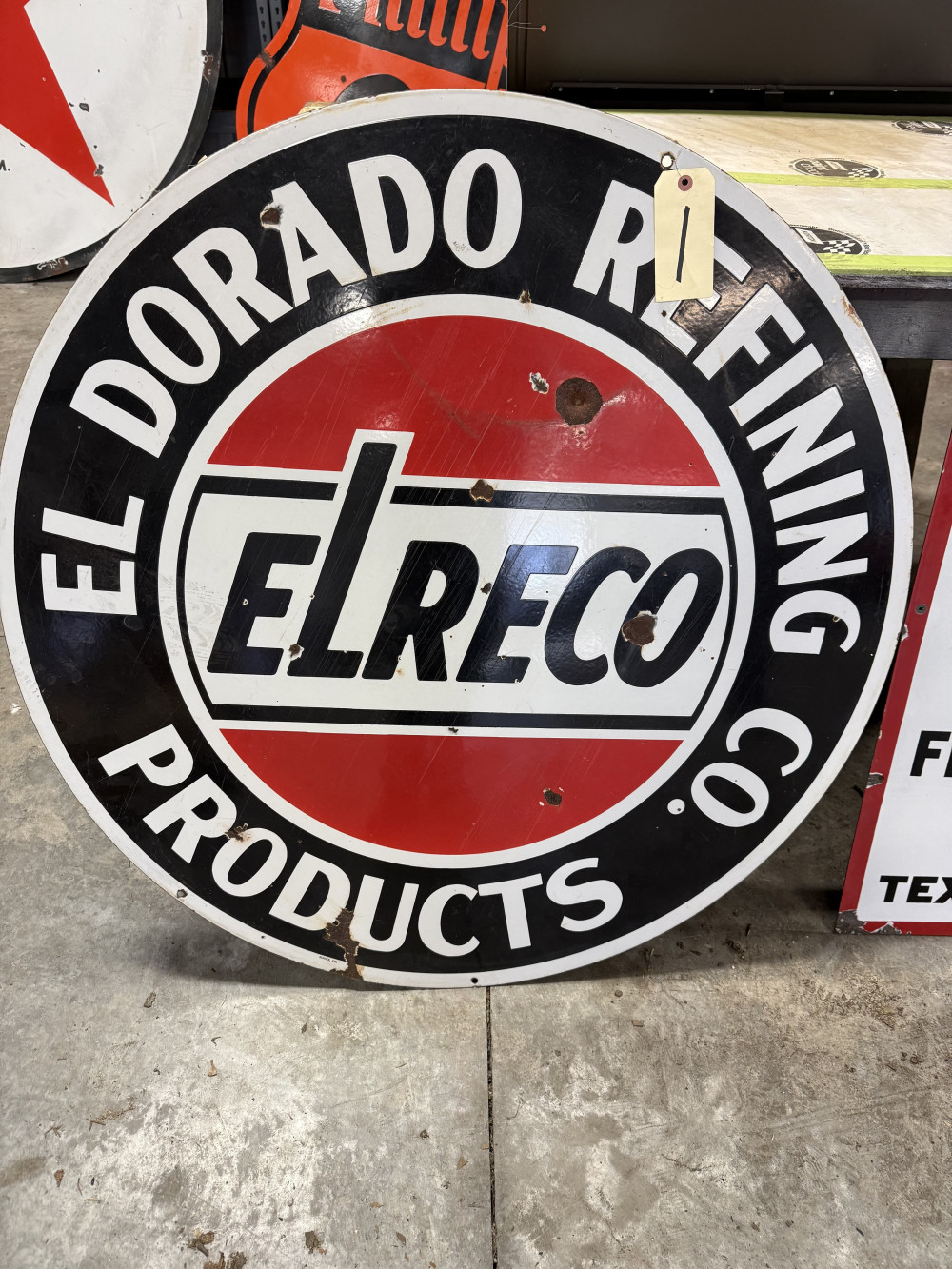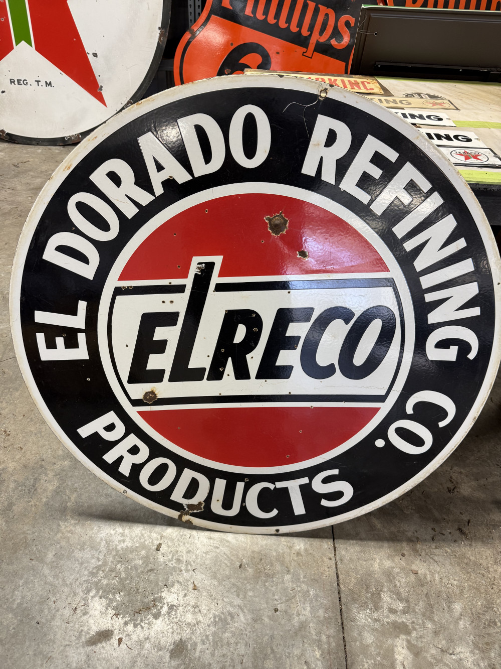 43 1/2" DOUBLED SIDED EL DORADO REFINING CO. PORCELAIN SIGN (#1) STEVE CONRAD ESTATE AUCTION, GORE OK