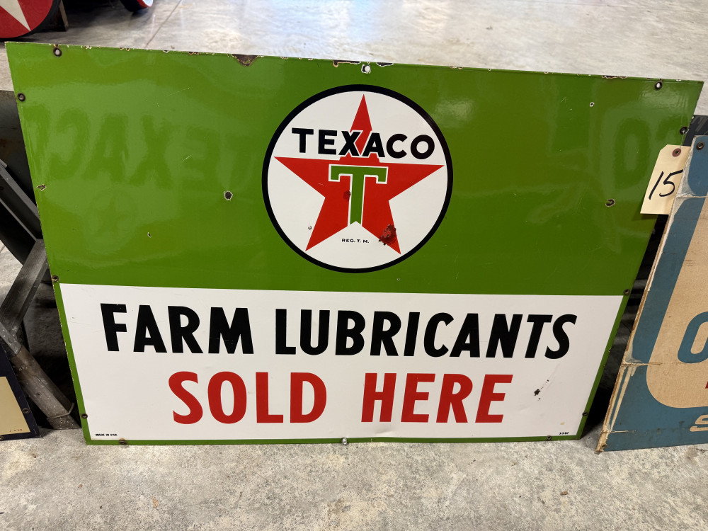 42" X 30" "FARM LUBRICANTS SOLD HERE" TEXACO TIN SIGN (#15) STEVE CONRAD ESTATE AUCTION, GORE OK