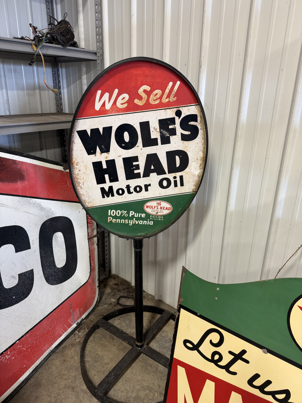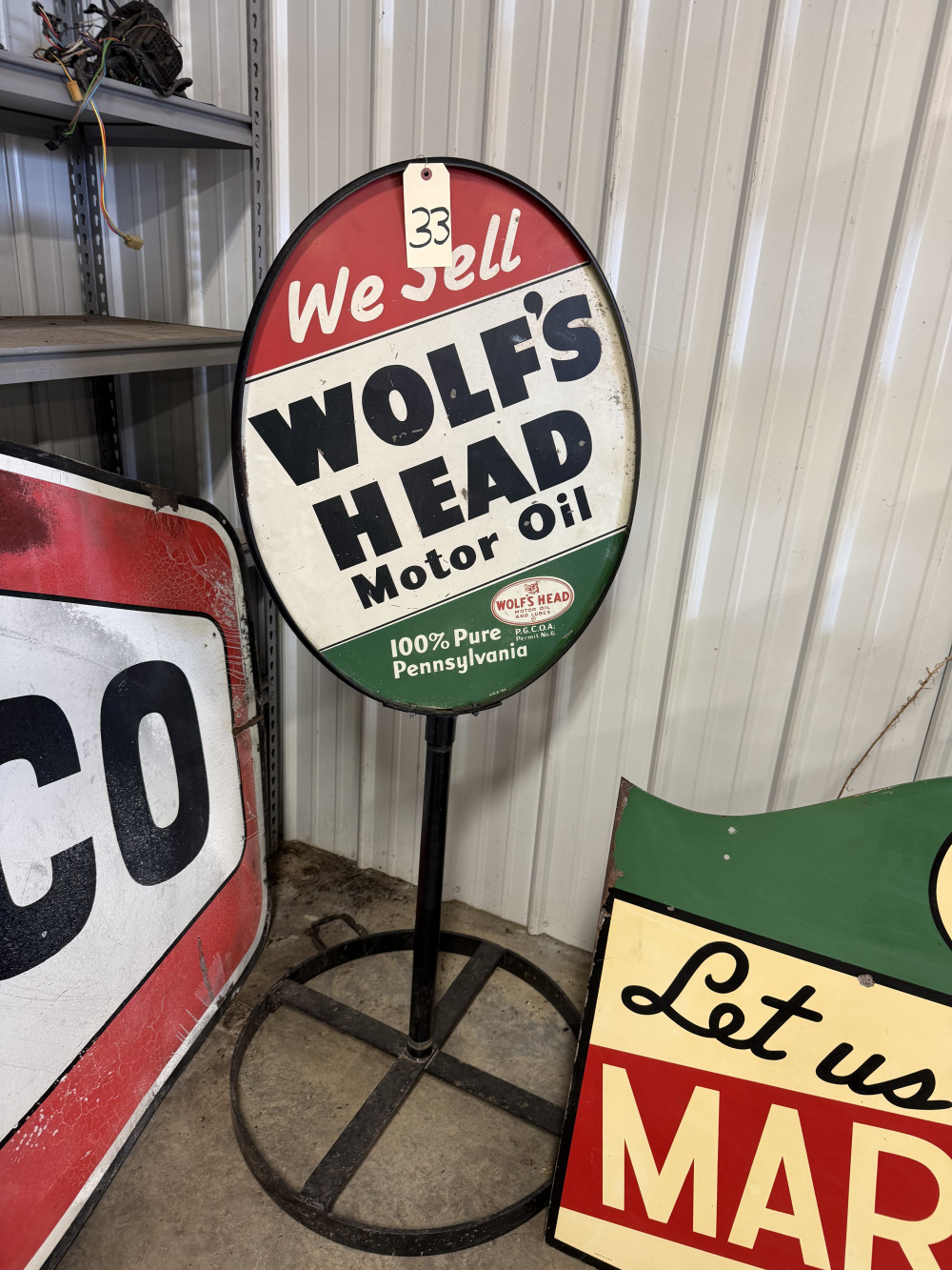 WOLF'S HEAD MOTOR OIL DOUBLE SIDED LOLLIPOP STYLE PORCELAIN SIGN (#33) STEVE CONRAD ESTATE AUCTION, GORE OK