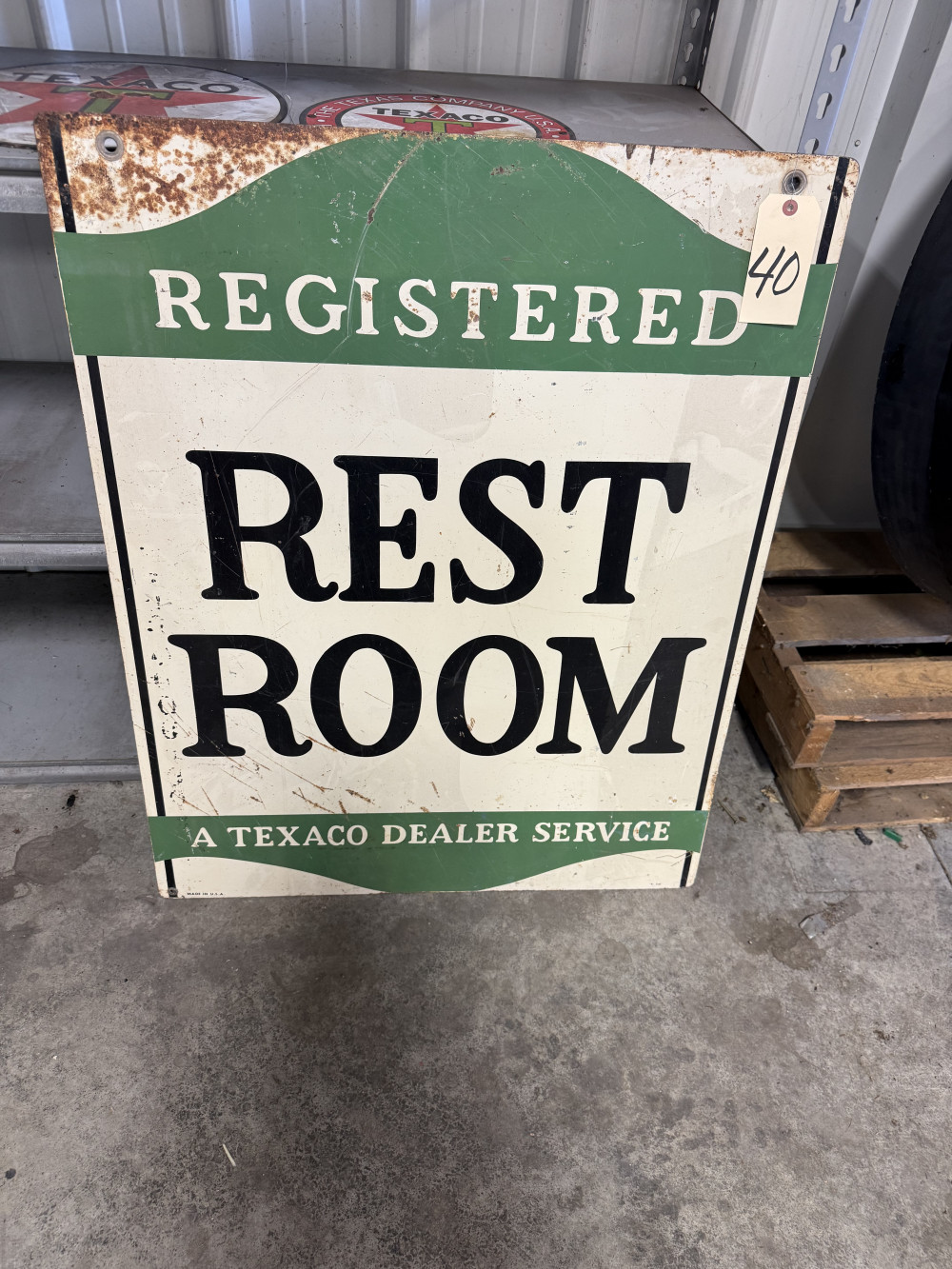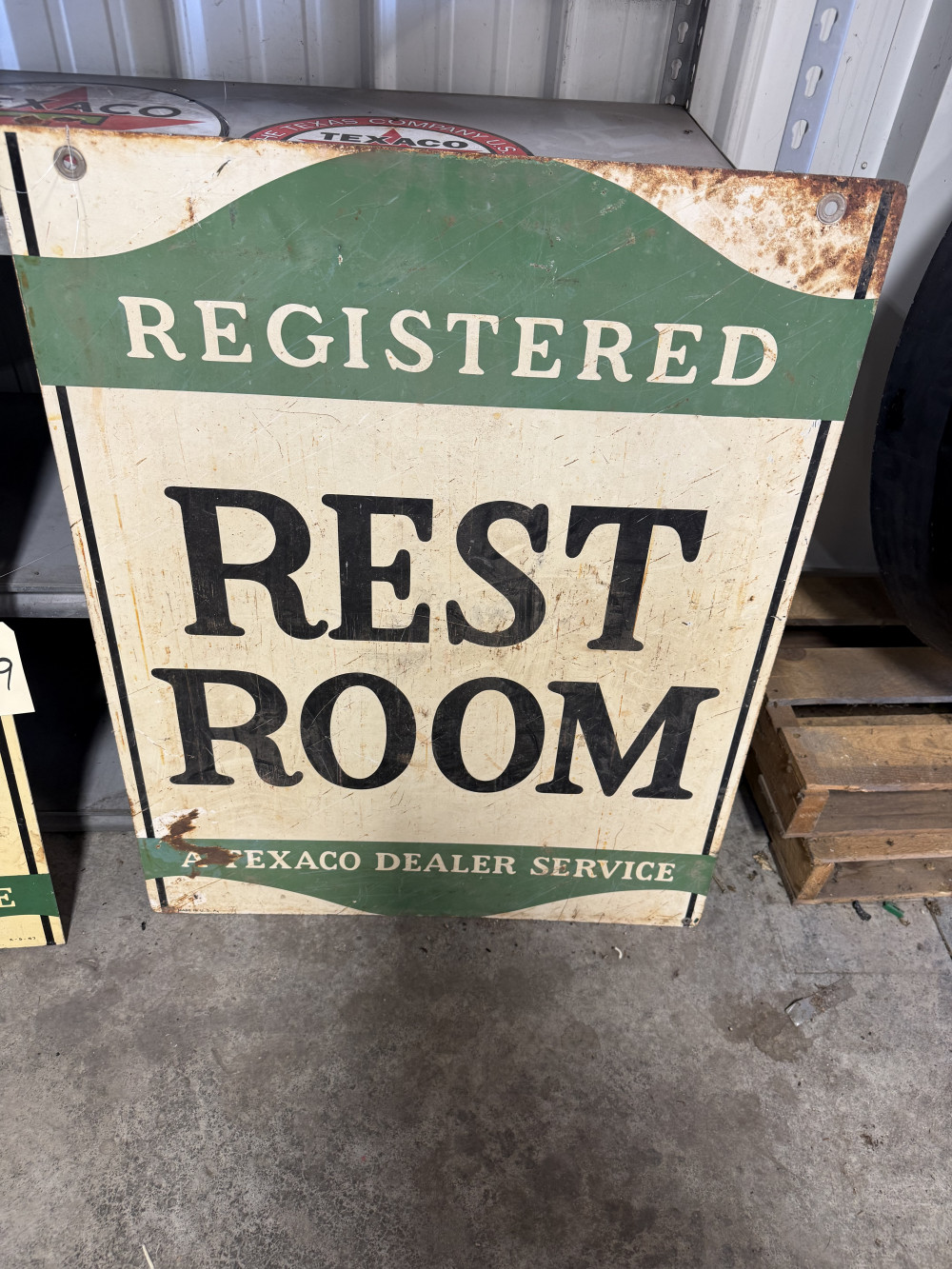 37" X 30" DOUBLE SIDED TEXACO REGISTERED REST ROOM PORCELAIN SIGN (#40) STEVE CONRAD ESTATE AUCTION, GORE OK