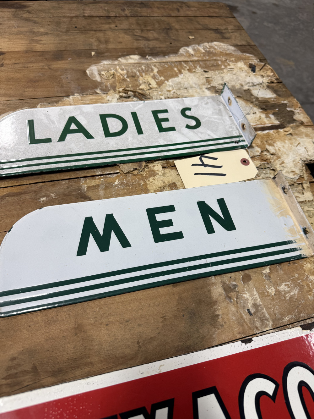 (2) 15" X 5" DOUBLE SIDED LADIES/MEN PORCELAIN FLANGE SIGNS (#41) STEVE CONRAD ESTATE AUCTION, GORE OK