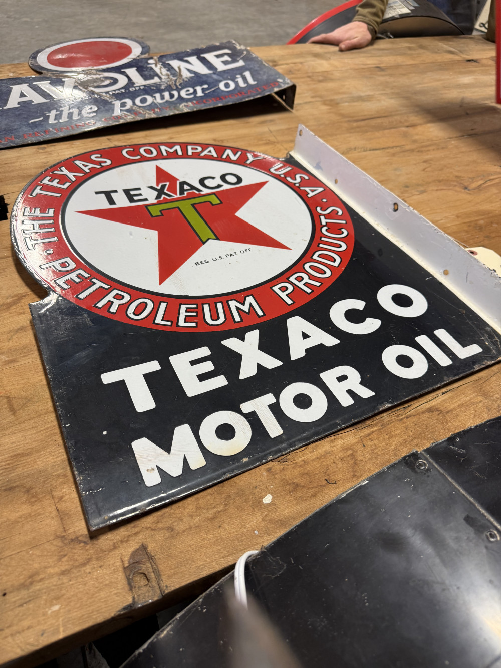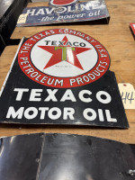 23" X 17" DOUBLE SIDED TEXACO MOTOR OIL PORCELAIN FLANGE SIGN (#44) STEVE CONRAD ESTATE AUCTION, GORE OK