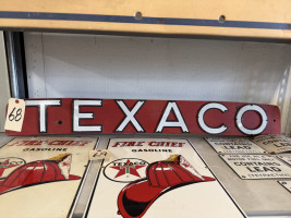 SMALL WOODEN SIGN W/PORCELAIN TEXACO LETTERS (#68) STEVE CONRAD ESTATE AUCTION, GORE OK