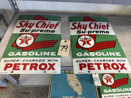 (2) TEXACO SKY CHIEF "PETROX" PORCELAIN SIGNS (#79) STEVE CONRAD ESTATE AUCTION, GORE OK
