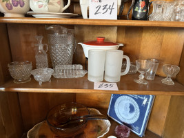 #234 — GRAVY BOATS, BUD VASES, PYREX CASSEROLE WITH SILVER PLATE WARMING STAND