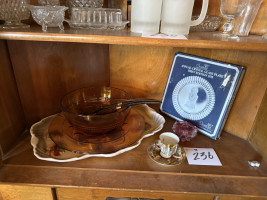 #236 — AMBER GLASS SERVING BOWL W/LADEL AND SERVING PLATTER, COLLECTOR PLATE, TEA CUP/SAUCER