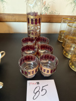 #85 — CULVER CRANBERRY SCROLL BARWARE W/PITCHER AND LOWBALL GLASSES, 22KT GOLD OVERLAY